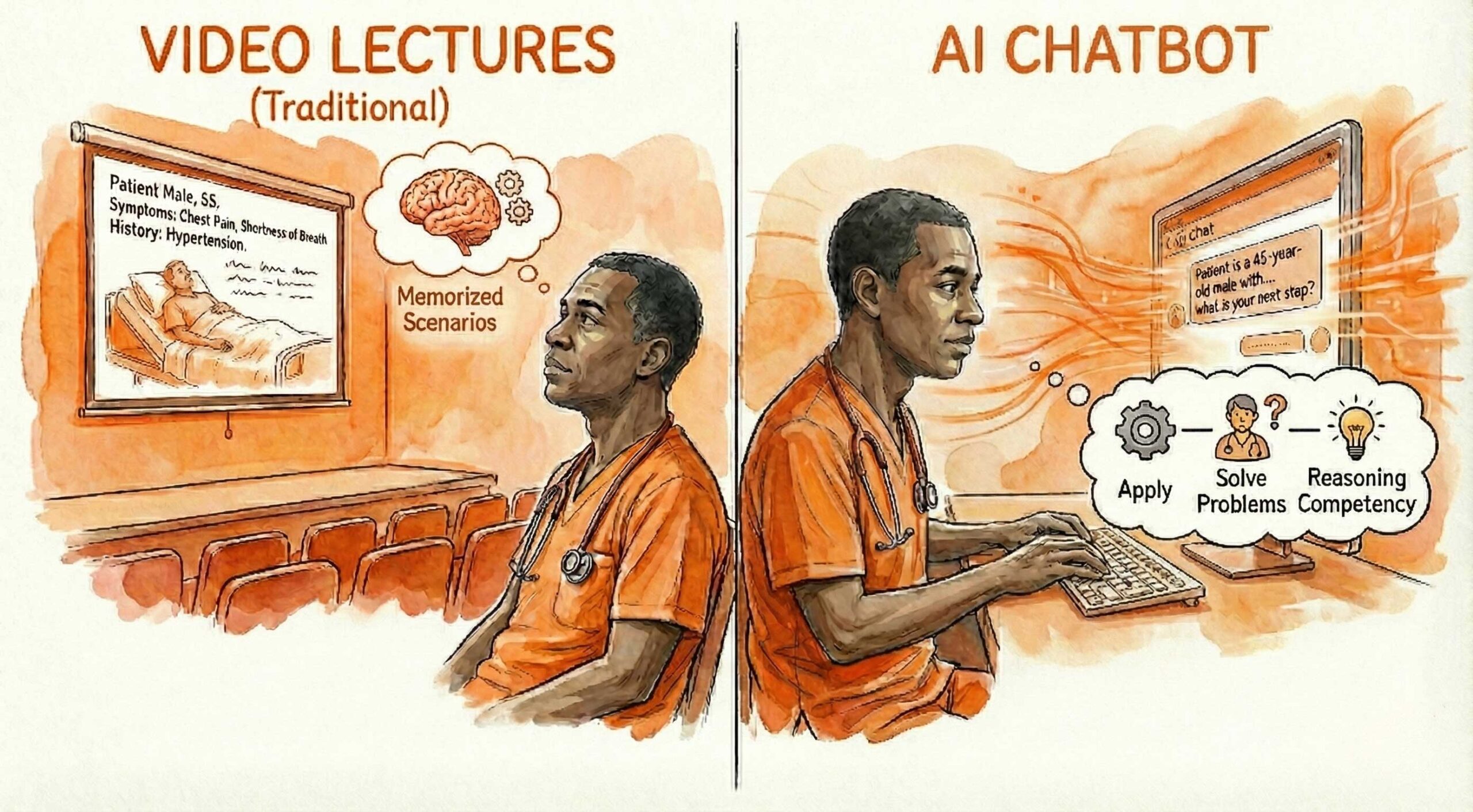 While communication training has received the most attention, AI is also transforming how students develop clinical reasoning. Large language models can now generate infinite variations of clinical cases, ensuring students face different presentations rather than memorizing specific scenarios [11]. A South Korean study found that students using an AI chatbot to learn mechanical ventilation showed significantly higher clinical reasoning competency than those who watched video lectures, even though raw knowledge scores were similar [12]. The AI helped students apply their knowledge to solve problems.